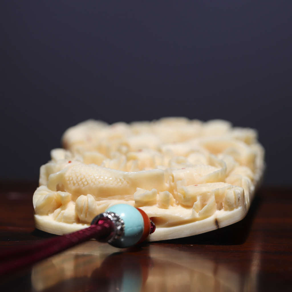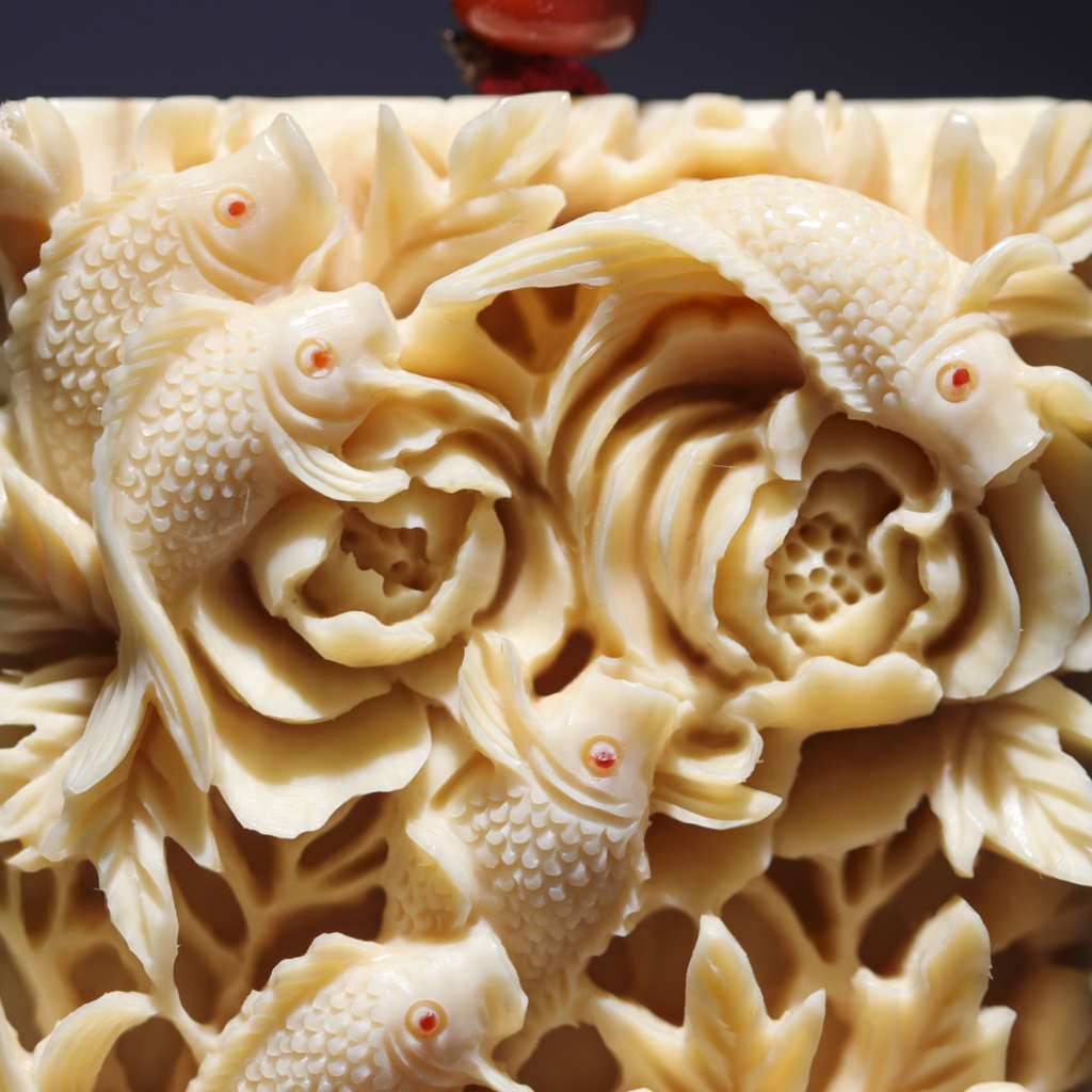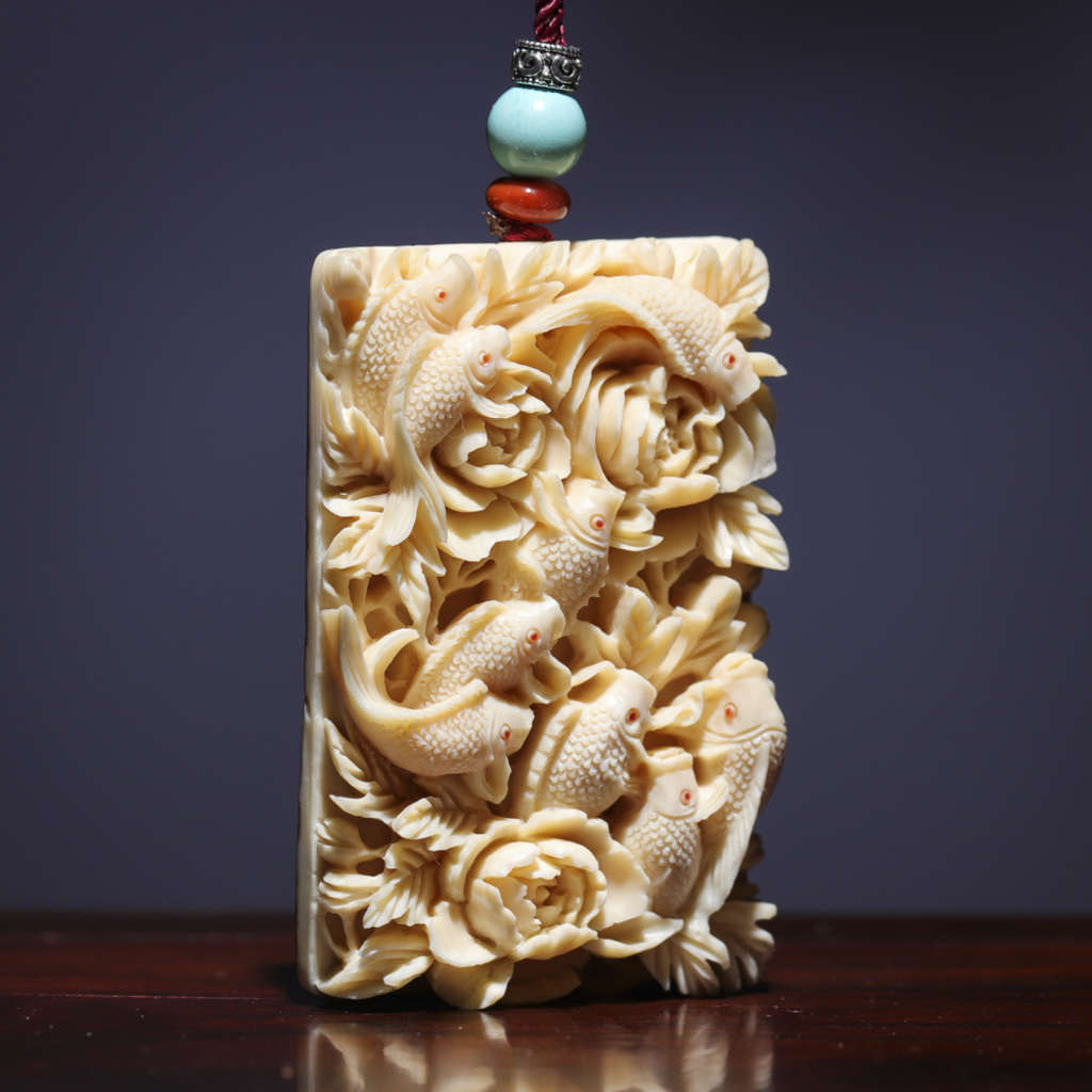 【猛犸牙雕作品】《九鯉富貴》,鯉魚牡丹皆為吉祥富貴的象征,寓意招財進寶、富貴吉祥。同時亦有鯉魚逆流前進、躍門化龍之說,寓意升官發財、飛黃騰達。精選猛犸帶皮冰料!料子潤澤,紋路清晰,老師傅純手雕刻,細節完美!