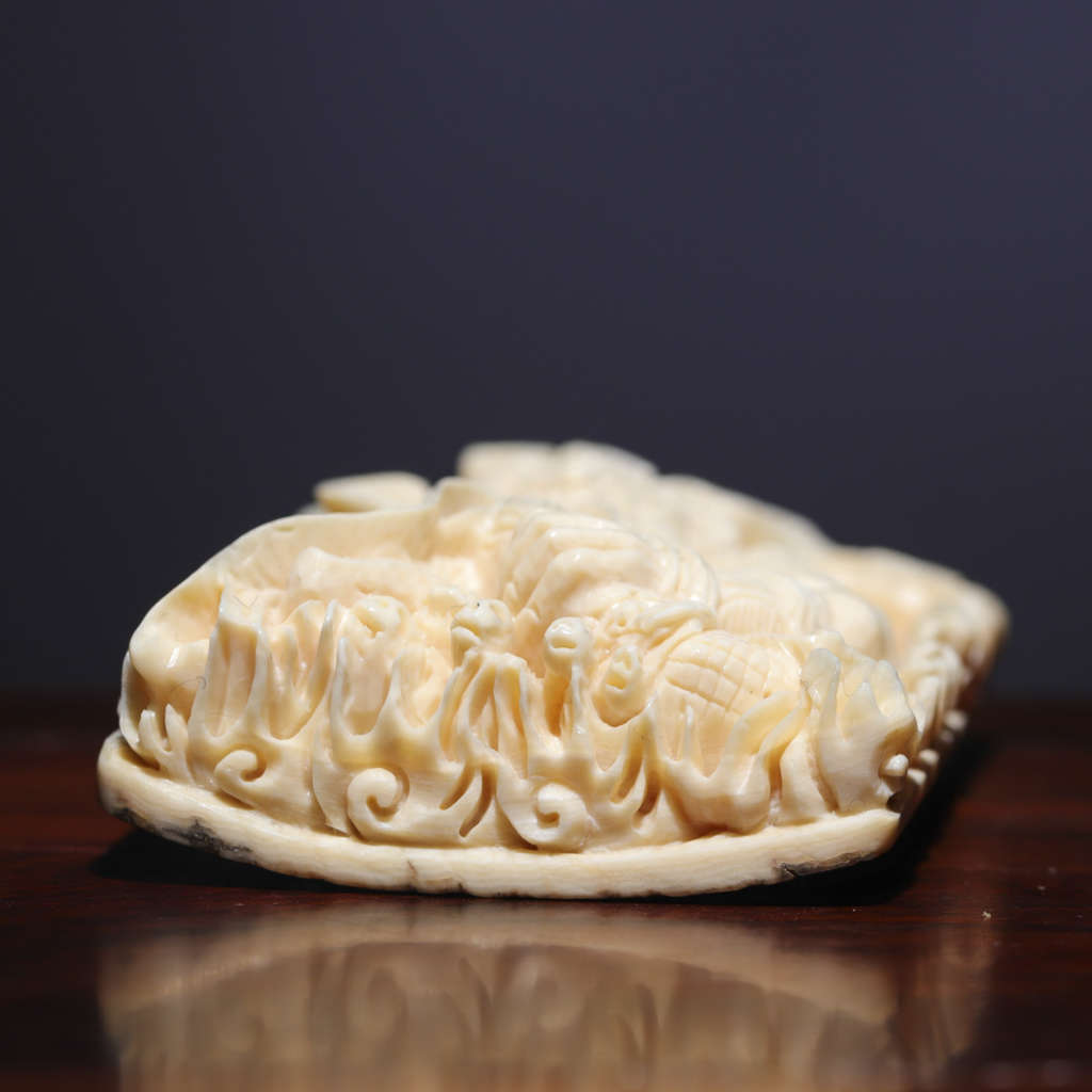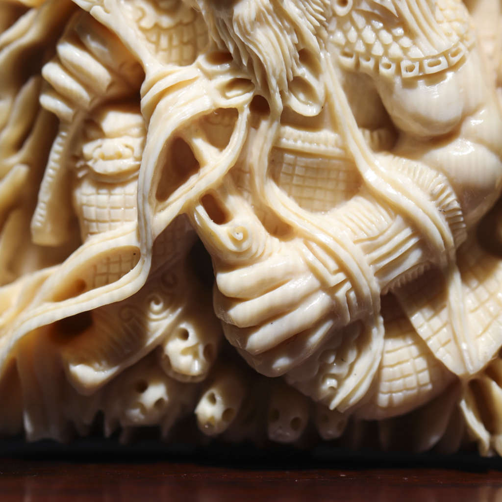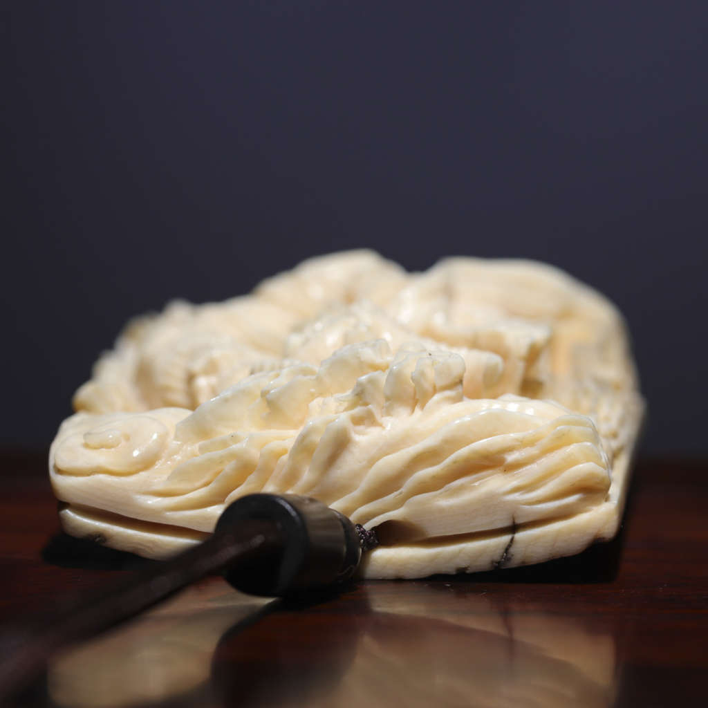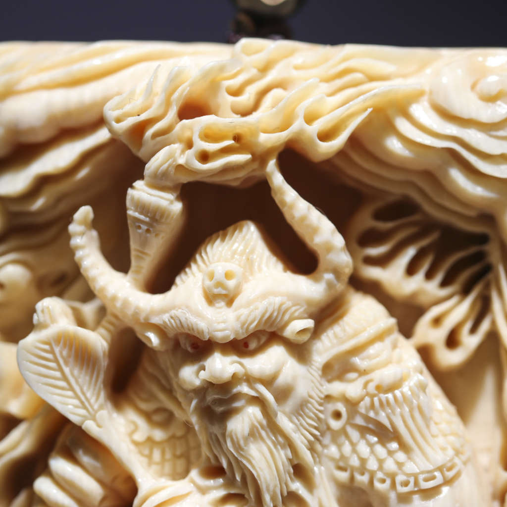 【猛犸牙雕作品】《牛魔王》,資深老師傅創(chuàng)作款!題材新穎,雕工精湛細(xì)膩。牛魔手持火把與芭蕉扇,神態(tài)傳神,意境絕佳!料子紋路飽滿,質(zhì)感潤澤,背面金皮滄桑古樸,韻味十足!