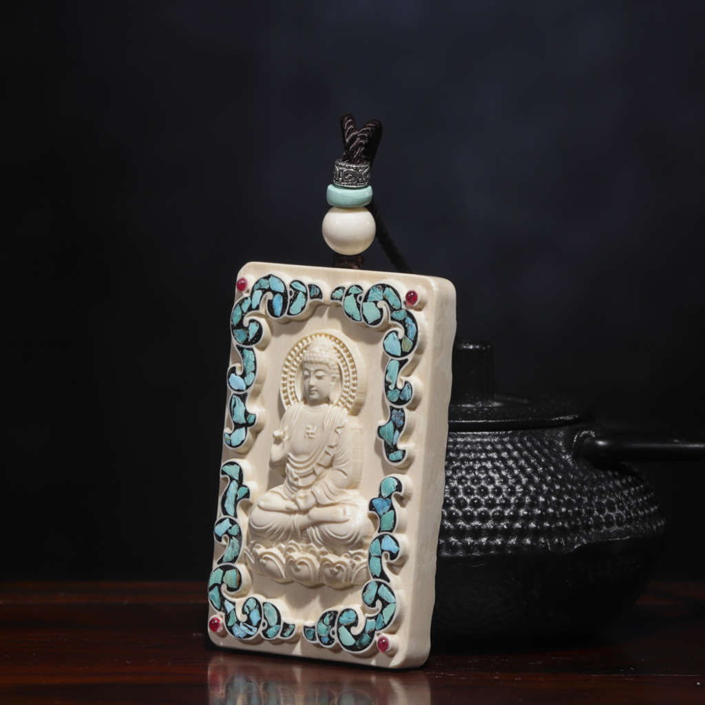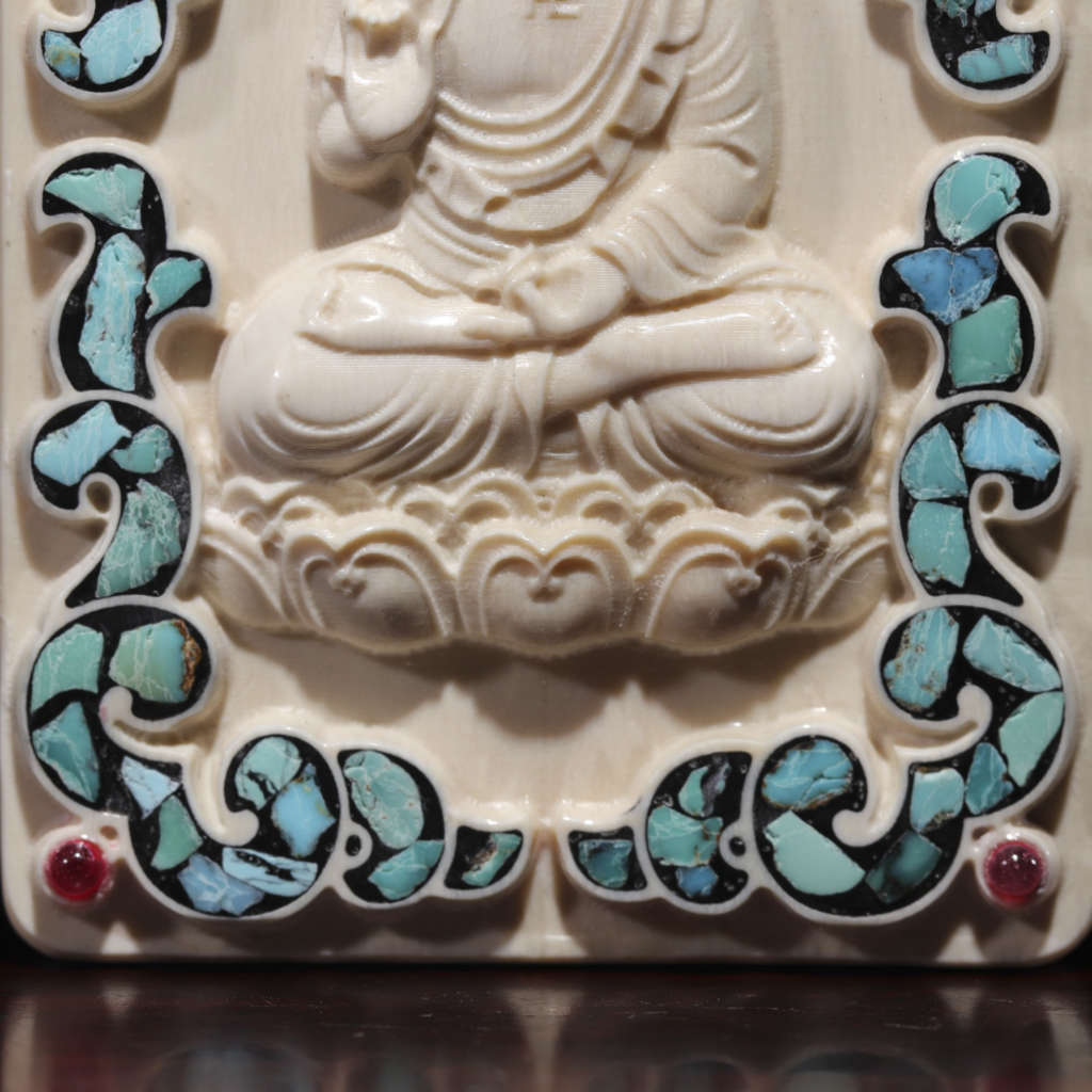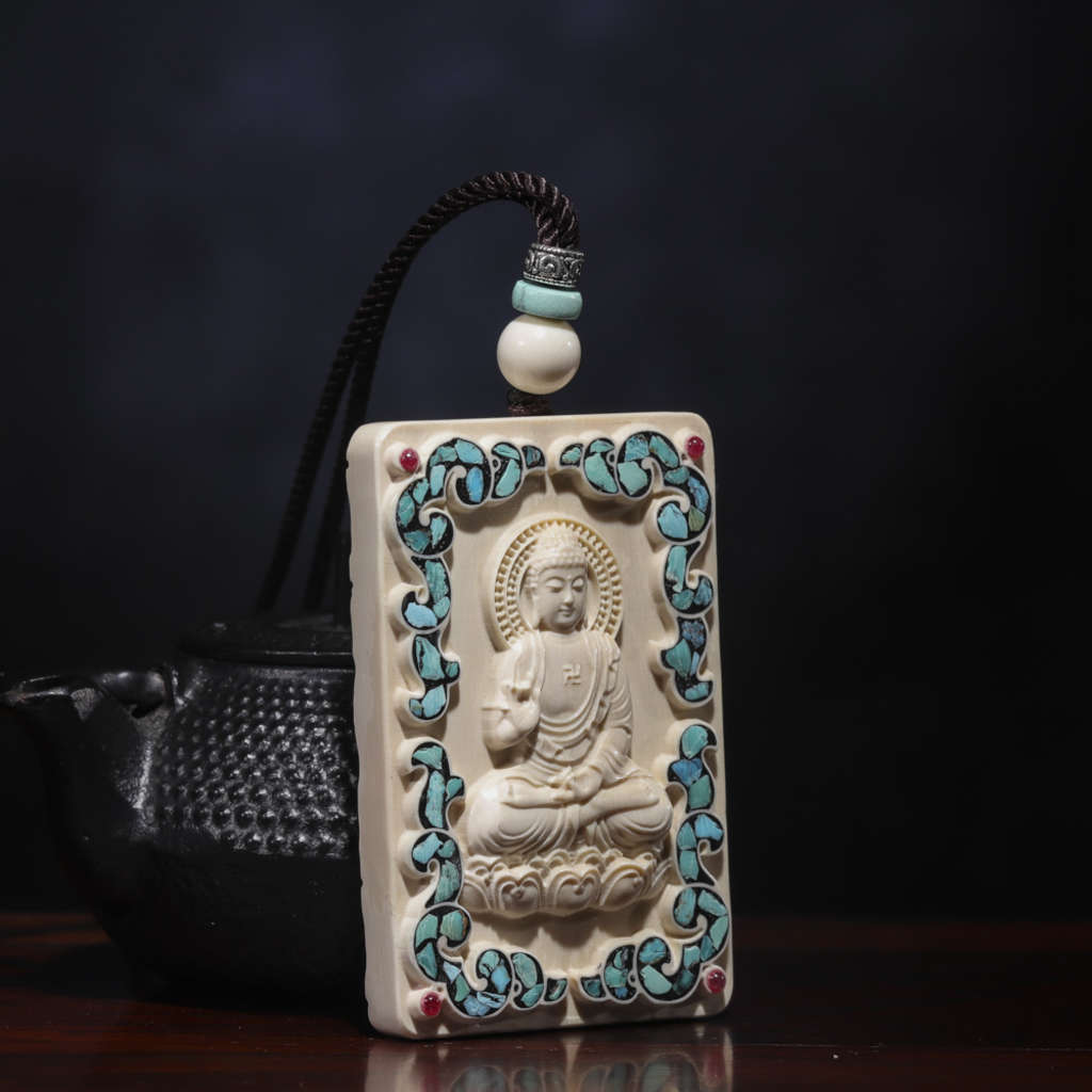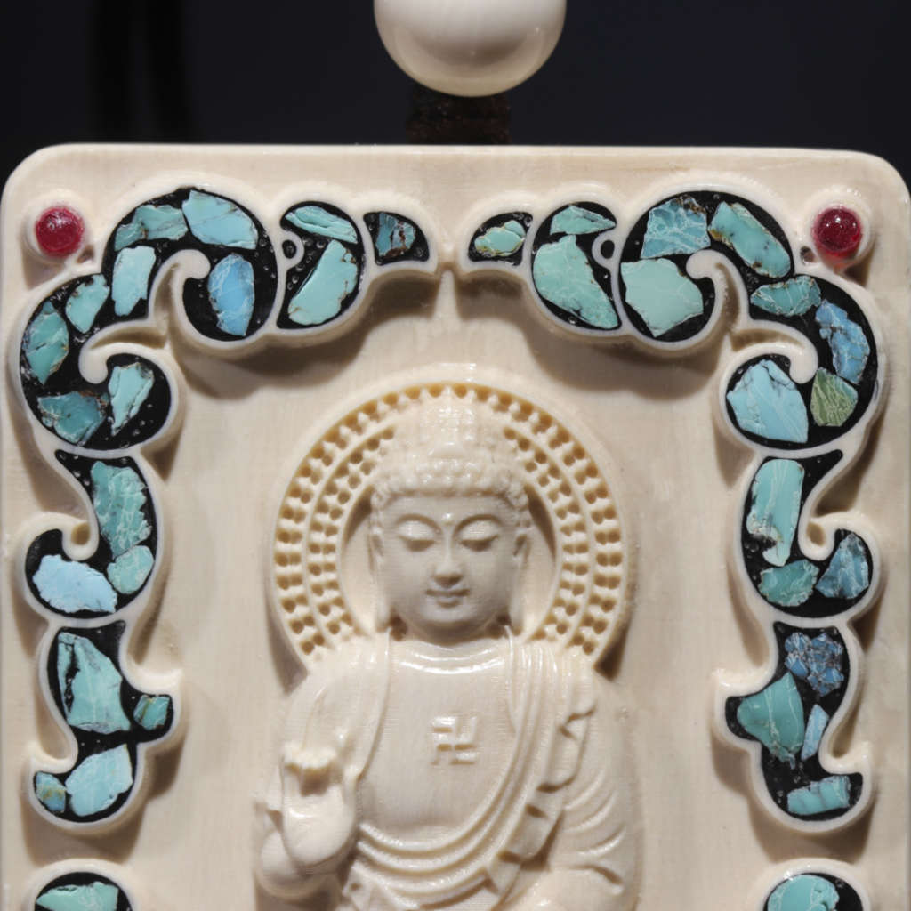 【猛犸牙雕作品】《阿彌陀佛》,精選上乘猛犸冰料!設計精巧,雕工細膩!正面手工鑲嵌綠松、南紅,十分漂亮。背面雕刻有六字真言蓮花祥云,驅邪辟兇、吉祥如意!
