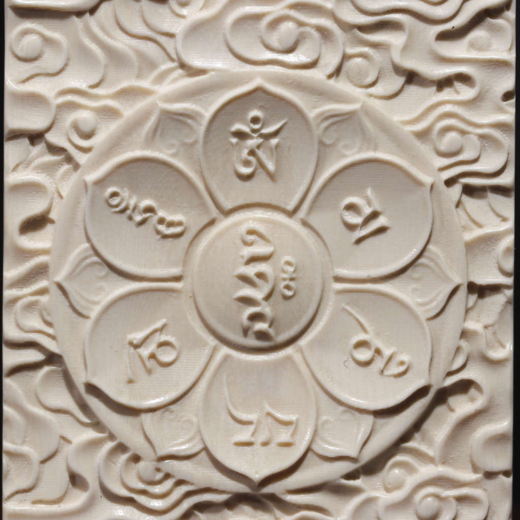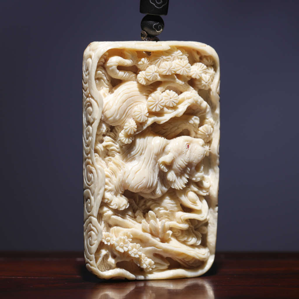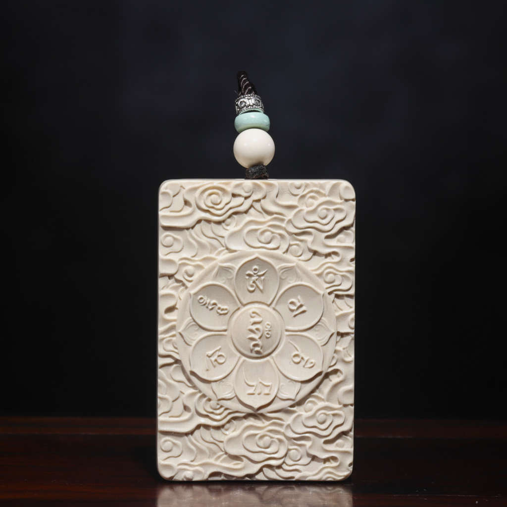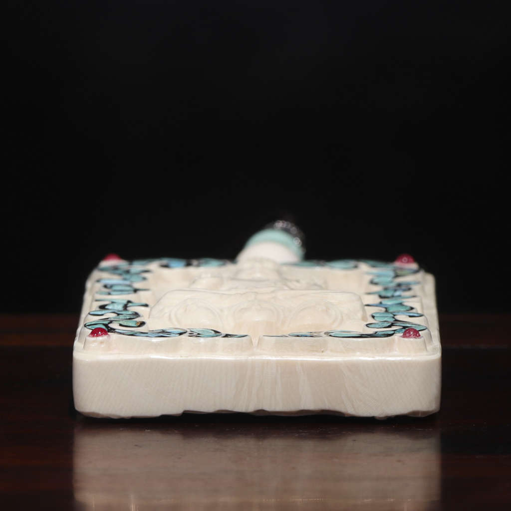 【猛犸牙雕作品】《阿彌陀佛》,精選上乘猛犸冰料!設計精巧,雕工細膩!正面手工鑲嵌綠松、南紅,十分漂亮。背面雕刻有六字真言蓮花祥云,驅邪辟兇、吉祥如意!